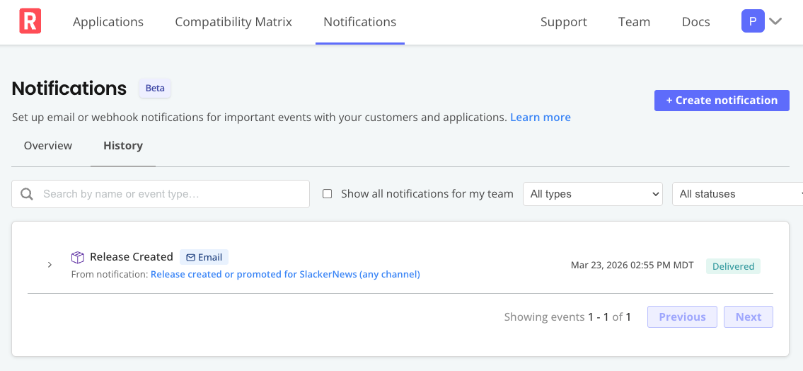 This topic describes how to view, edit, disable, and delete event notifications in the Replicated Vendor Portal. For more information about the Event Notifications (Beta) feature, see About event notifications (Beta).