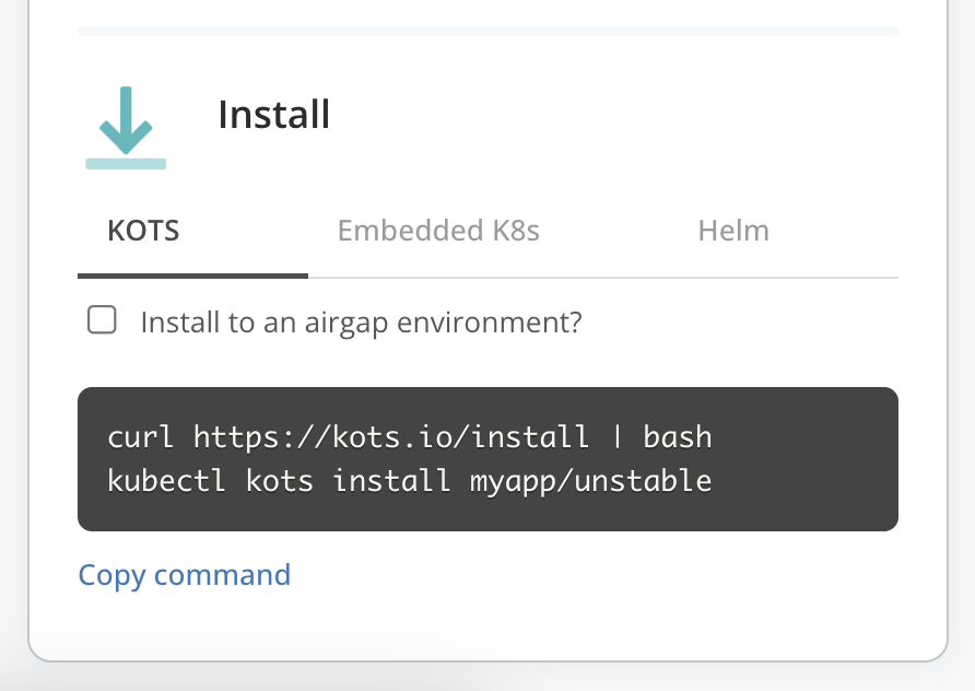 View the command for installing with Replicated KOTS in existing clusters.